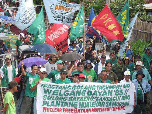 | フィリピンは今 ― くすぶる原発計画と米軍基地復活?― コラソン・ファブロス (11月22日、大阪での講演より) 原発と核兵器に抗して 私が所属する非核フィリピン連合は、いわば二つの顔を持っています。一つは、原発に反対すること、もう一つは、核兵器に反対することです。核兵器の問題も扱うことから、フィリピンにおける米軍基地の問題にも関わっています。ここ数年は、より喫緊の課題であった米軍基地の問題に軸足を置いて活動してきました。しかしフィリピン政府が再び原発建設に強い関心を示し始めたため、私たちももう一度原発反対運動に力を入れ始めたところです。 独裁の象徴、バタアン原発 フィリピンでは、バタアン原発に反対して激しい運動が展開されました。バタアン原発は建設されましたが、民衆の反対運動があまりに激しかったため、一度も稼働したことはありません。今もバタアン州モロンで、その姿をさらしています。 1958年にフィリピン原子力委員会が設立され、1960年代に独裁的なマルコス政権が原発建設計画を推し進めました。1972年に戒厳令が敷かれる中、1973年になるとマルコス大統領がフィリピン国内の原子力産業育成を命じます。76年には汚職と腐敗の中で、アメリカのウエスチングハウス社との間で加圧水型原発の建設契約が締結されました。予定地が選定され、1977年に建設開始、85年に完成しました。 1981年に戒厳令が解除されます。82年から86年のマルコス政権崩壊までの数年間、独裁政権に対する反対運動が国中に広がりました。バタアン原発の反対運動は、マルコス独裁に対する反対運動でもありました。安全性がないがしろにされ、マルコスとその取り巻きの癒着や汚職のひどさは目を覆うばかりでした。 そして1986年にチェルノブイリ事故が起こり、この悲劇がフィリピンの人々の意識を変えました。バタアン原発を絶対に動かしてはいけないという思いが強まりました。チェルノブイリ事故が起きたのは、マルコスが打倒されて新政権が生まれたころでした。ピープルパワー革命と呼ばれた大きなうねりが、バタアン原発を閉鎖へと追い込みました。 原発の亡霊の再来 それからずっと、政府が原発への関心を示すたびに抗議が巻き起こり、原発計画を断念させてきました。各国の原子力産業が、いつもフィリピンで積極的にロビー活動を行っています。もちろんフィリピンだけではなく、東南アジアがそうした対象となっています。 2008年、政府は強力に原発導入を検討し始め、韓国電力公社とバタアン原発再開の実現可能性調査を行うための覚書を結びました。このときも反原発運動、とくにバタアンでの反対運動が再び激しく巻き起こり、国会に上がった原発に関する法案はすべて否決されました。 ![]() バタアン、2009年6月 2010年に政権が交代すると、再びエネルギー問題が取りざたされるようになりました。バタアン原発再開や新規の原発建設が議論に上り、フィリピン全土に13か所の予定地があることも明らかになりました。 2011年には、バタアン原発再開の可能性に関する評価が行われ、再開は妥当ではないという結論になりました。これでバタアン原発自体の再開はなくなりましたが、新規建設は模索されています。 ずさん極まりないバタアン原発 推進派は、いまだに原発はクリーンだと主張しています。バタアン原発の経緯から、反原発意識の強い民衆を早い時期から「教育」していこうと、学校のカリキュラムに介入して原発推進教育を行っています。 原発が危険なことはすでに明らかですが、バタアン原発の場合は、フィリピン科学者会議による技術監査によって、明らかな欠陥が4000か所以上見つかったのです。しかも、ナティブ火山のすそ野に建てられているので、地震や噴火の影響で大事故を引き起こす可能性もありました。環太平洋地震帯の中にフィリピンも位置しているのです。 福島原発事故レベルの事故が起きた場合に、アメリカの基準を当てはめると、半径80km圏内の人々が避難しなければなりません。バタアン原発に当てはめると2000万人が避難を強いられるのです。私たちは、政府によって予定地とされている他の地点についても、この半径80kmを地図に落とし込むことで、どれだけの被害の広がりがもたらされるかを人々に伝えています。 バタアン原発は、建設コストが国民に大きな負担となりました。そもそも契約が成立したときは6億ドルだったのに、できあがったときには23億ドルにも膨れ上がっていました。フィリピンが世界銀行から融資を受けた案件のなかで、最大のものでした。金額が膨れ上がった理由は、マルコスらが私腹を肥やしたこと、官僚の汚職などもありましたが、ウエスチングハウスが値段を釣り上げて行ったという事情もありました。その返済に30年かかりました。つい最近、完済しましたが、国民にとってあまりにも大きな負担となりました。 フィリピンを狙う原発企業 様々な原発企業が、輸出を狙っています。