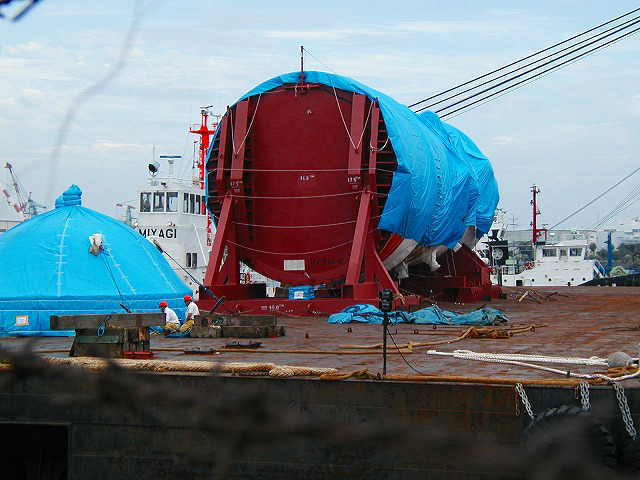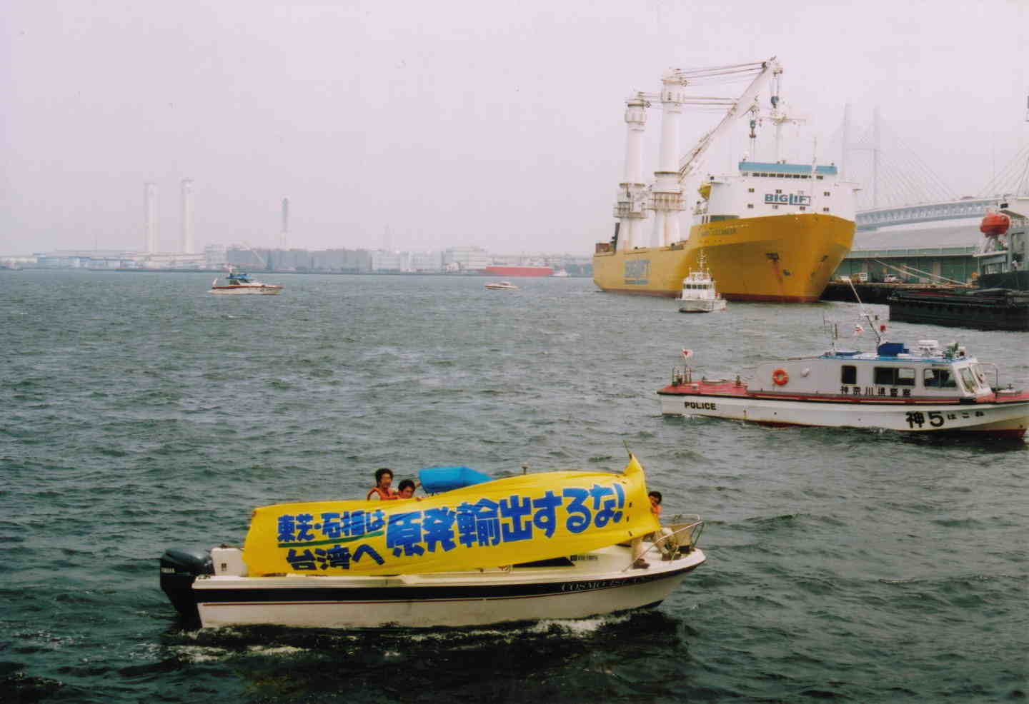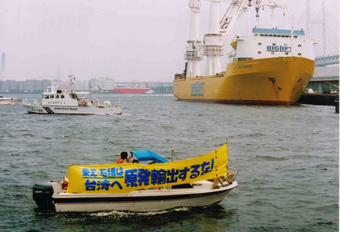 台湾へ原発を輸出するな! 7・1抗議行動 東芝・石播(IHI)の原子炉圧力容器が 「HAPPY BUCLANEER」号によって 台湾第四原発に向けて、「7月1日搬出」、とのことで 25名で横浜港・山下埠頭で抗議行動を行いました この日は結局出港せず(台風の影響か?)、 2日朝出港してしまいました 以下、ヨコスカ平和船団とともに行った海上抗議行動の写真(撮影・今井明) [[目次へもどる]